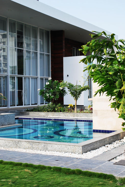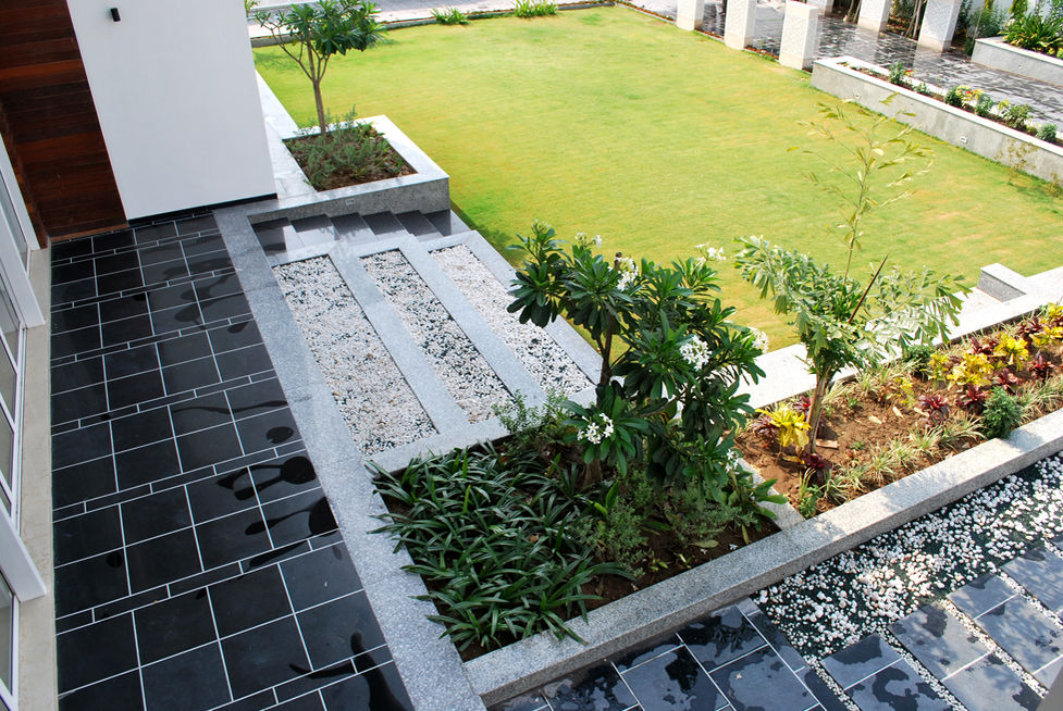Structurally, the design consists of a driveway leading to a drop off plaza which in turn leads to the house through a path next to central water-body and the main lawn. The outdoor dining area and play areas are placed at the rear to give them their privacy.