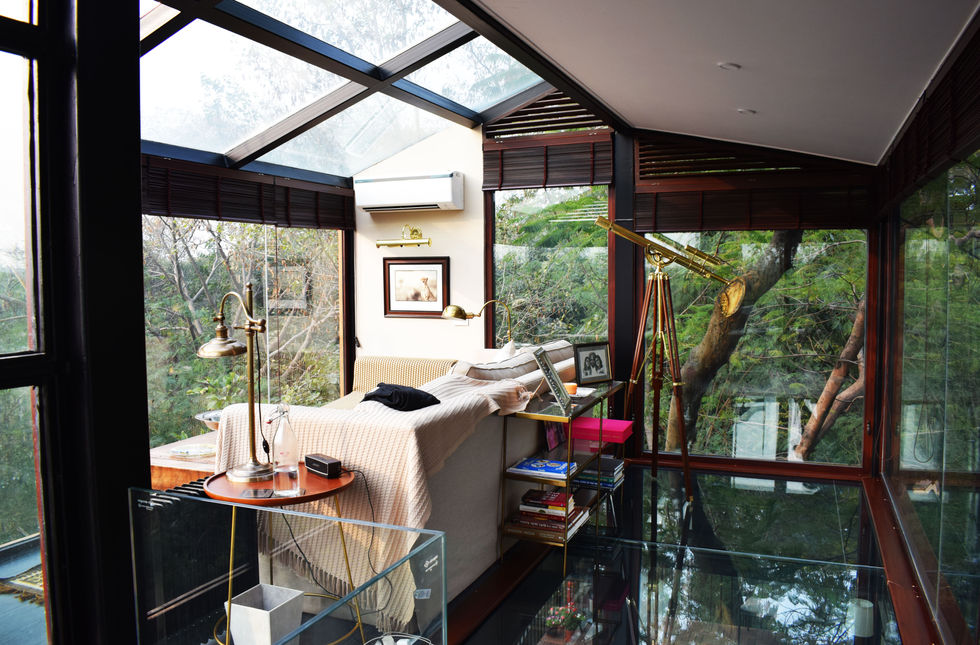 Somewhere in Delhi, not too far away from Delhi life, on the edge of a self-created Jungle of native trees, lies this small Glasshouse to give expansive views of the Jungle and the sunset!! The Glasshouse is literally all glass, including the roof!! A rickety guard room made out of bamboo and wood stood in its place. It was used by the owner to feed Nilgais in the Jungle. So, he wanted to make a space from where he and his family could enjoy the spectacular view!!